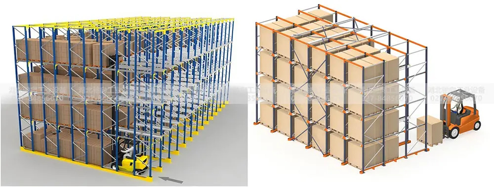 普通叉車(chē)搭配:一整棟式貨架,沒(méi)有專(zhuān)門(mén)的叉車(chē)通道,由叉車(chē)駛?cè)胴浖軆?nèi)部存取貨物。